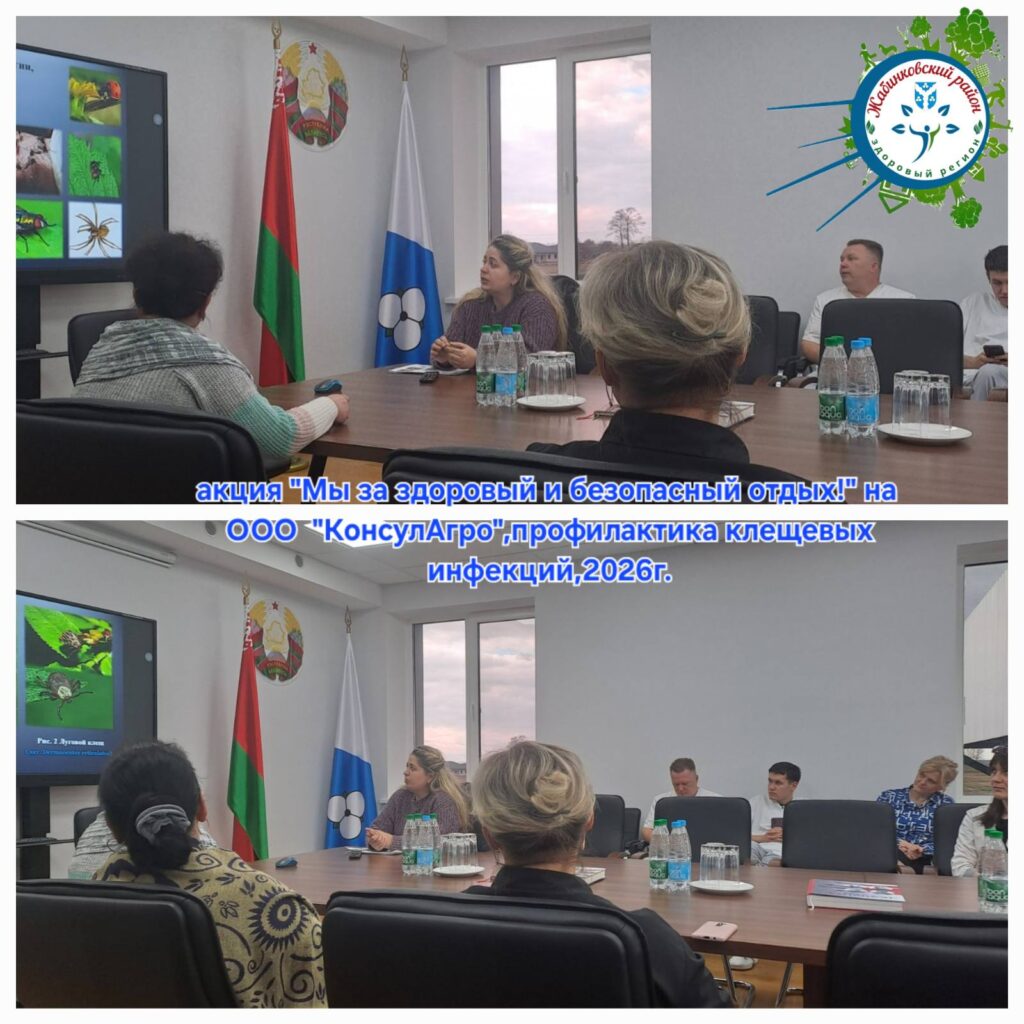 08.04.26г. энтомологом ГУ «Жабинковский райЦГЭ» проведена акция-лекция “Мы — за здоровый и безопасный отдых!». Темой обсуждения стали клещи и профилактика клещевых инфекций» в рамках реализации государственного профилактического проекта «Жабинковский район – здоровый регион» для работников предприятия ООО «КонсулАгро».