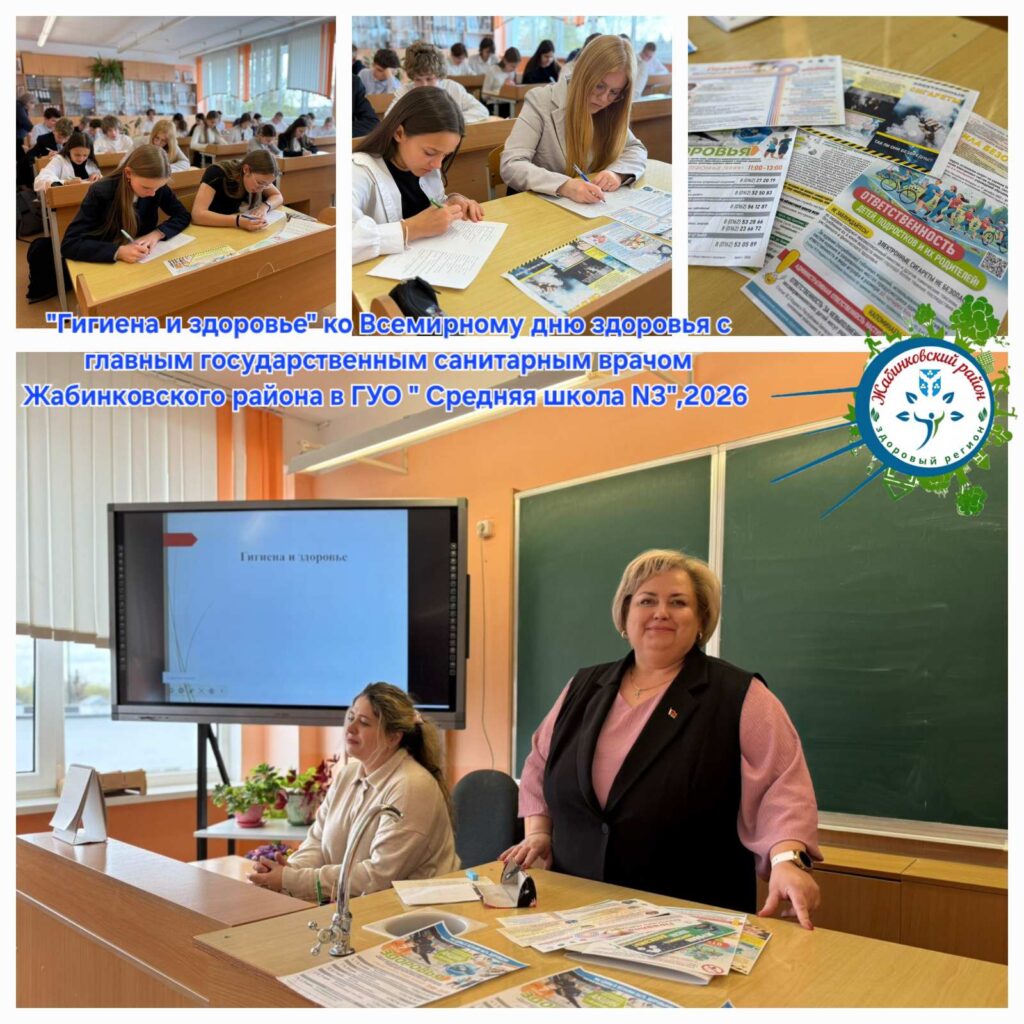 В рамках Плана мероприятий информационно — образовательной акции «Мы едины в желании быть здоровыми!» 13.04.2026г. в ГУО «Средняя школа №3» для учеников 7-х классов проведено мероприятие «Здоровье и гигиена» с участием главного государственного санитарного врача Жабинковского района Е.Е.Михальчук.