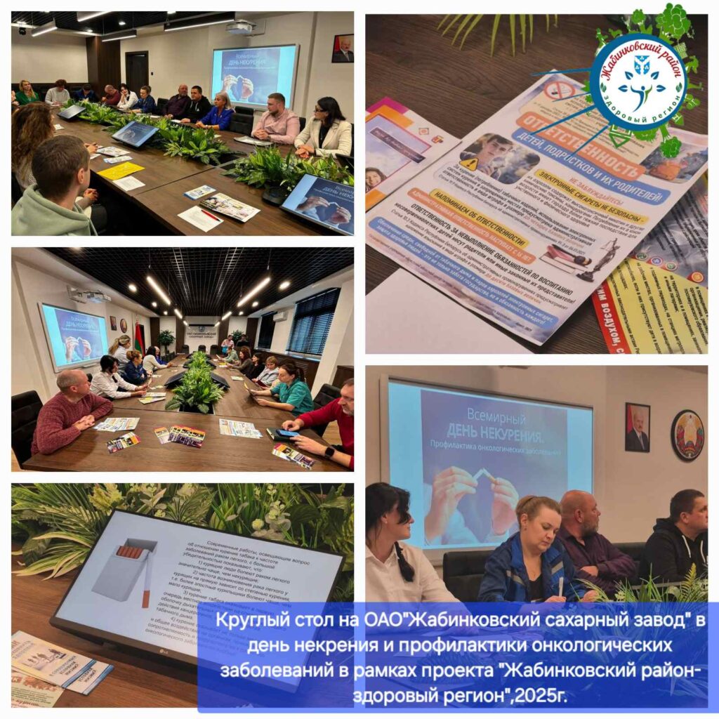 20.11.2025г. состоялся круглый стол «Борьба с курением» на базе                             ОАО «Жабинковский сахарный завод» с участием врача — оториноларинголога Гринюка К.И., врача – онколога, инструктора — валеолога Егоровой Е.П. В качестве гостя приглашена председатель Межведомственного координационного совета по формированию здорового образа жизни, контролю за неинфекционными заболеваниями — заместитель председателя Жабинковского районного исполнительного комитета Тарасевич И.В.