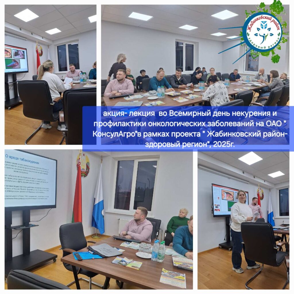 21.11.2025г. в завершении областной акции на территории Жабинковского района в рамках Всемирного дня некурения и профилактики онкологических заболеваний на базе предприятия          ОАО «Консул Агро» состоялась встреча — презентация с участием врача – онколога, ЛОР — врача ЦРБ и инструктора – валеолога ЦГЭ, организован просмотр видеоролика по профилактике табакокурения (парения); Обсудили влияние табака на здоровье, на развитие онкологических заболеваний, способы избавления от никотиновой зависимости.